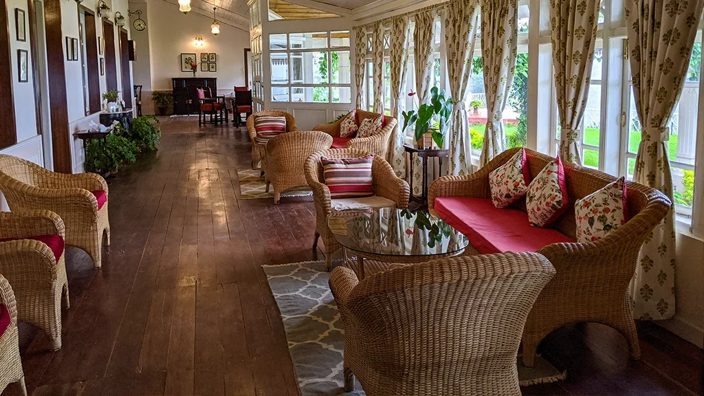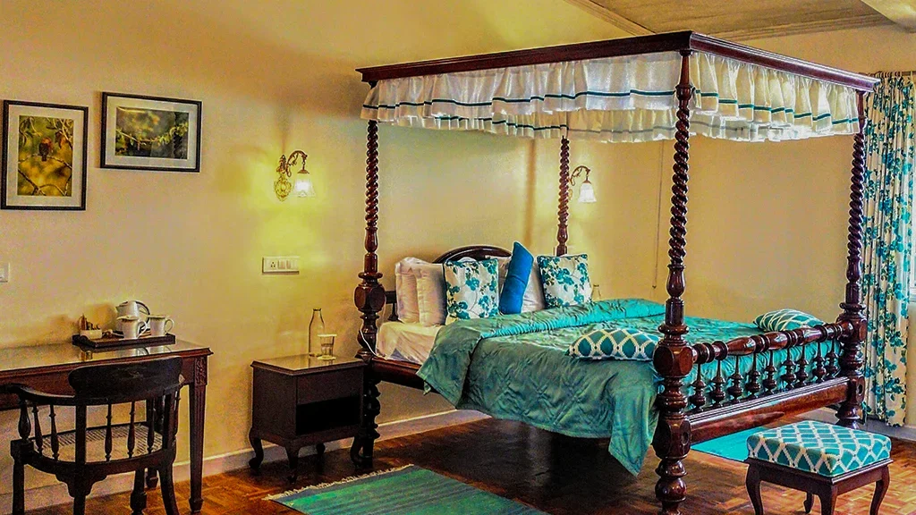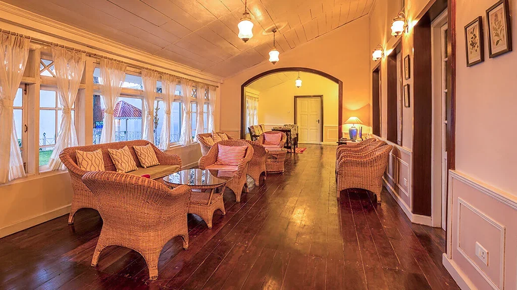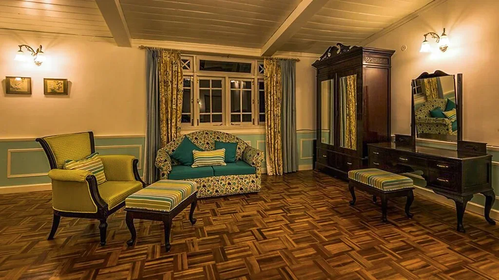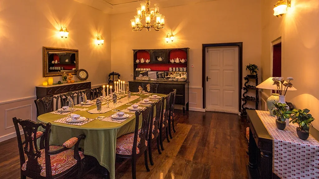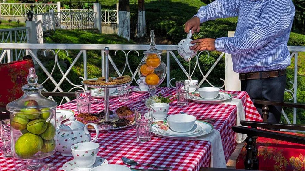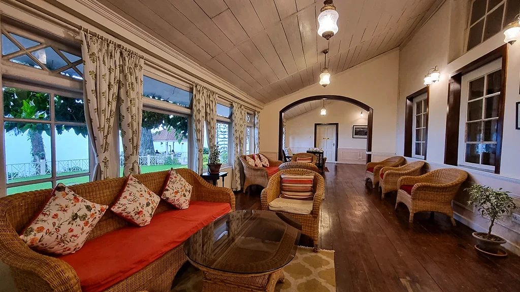 The retreat reflects the elegance of British era plantation homes, featuring spacious interiors, classic furnishings, and open verandahs overlooking tea gardens.