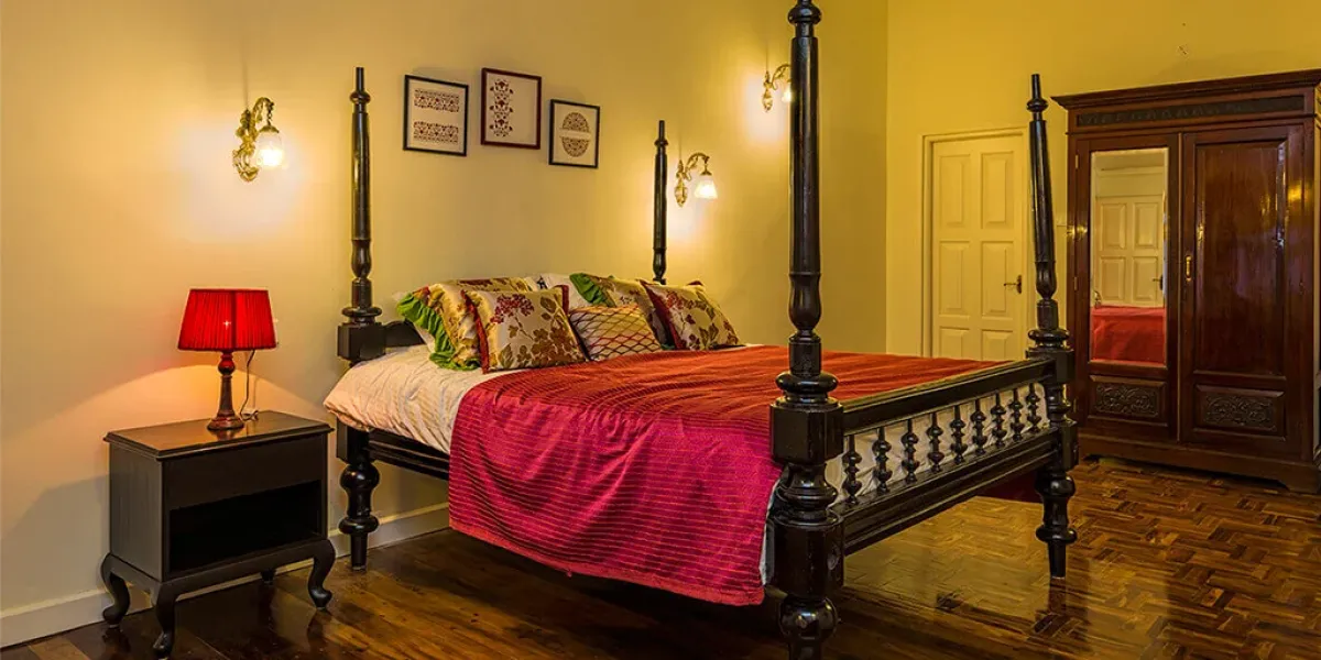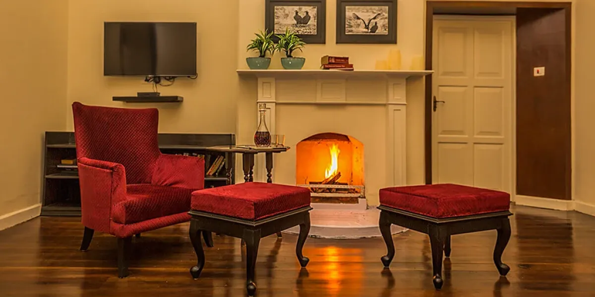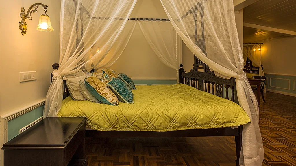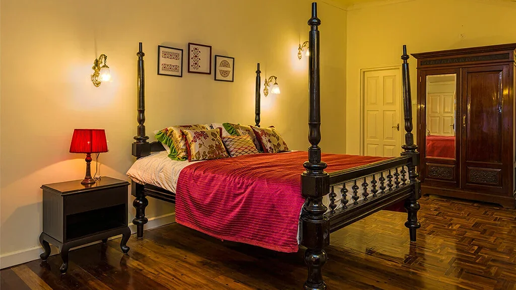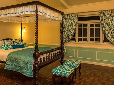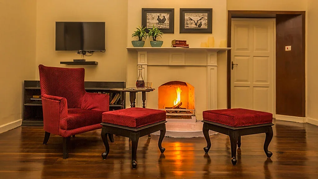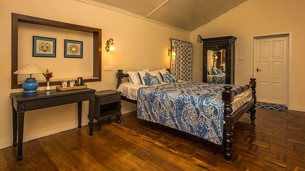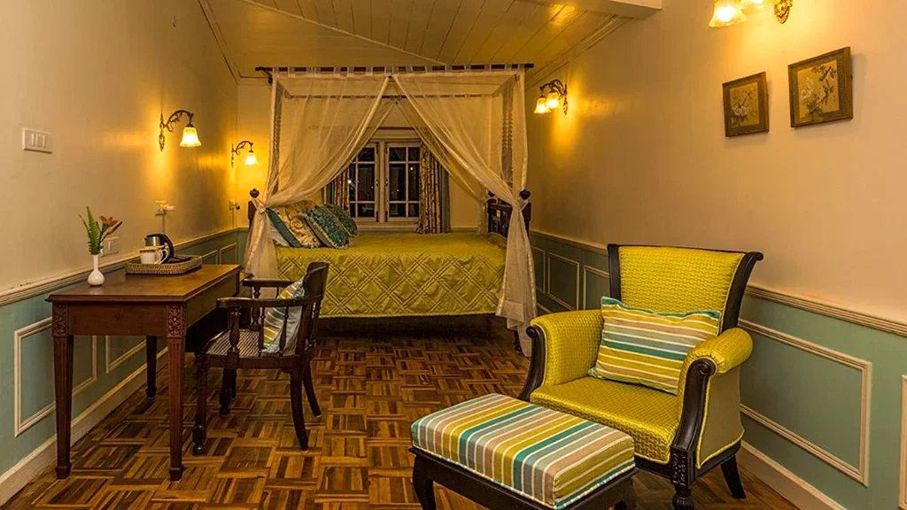The retreat reflects the elegance of British era plantation homes, featuring spacious interiors, classic furnishings, and open verandahs overlooking tea gardens.