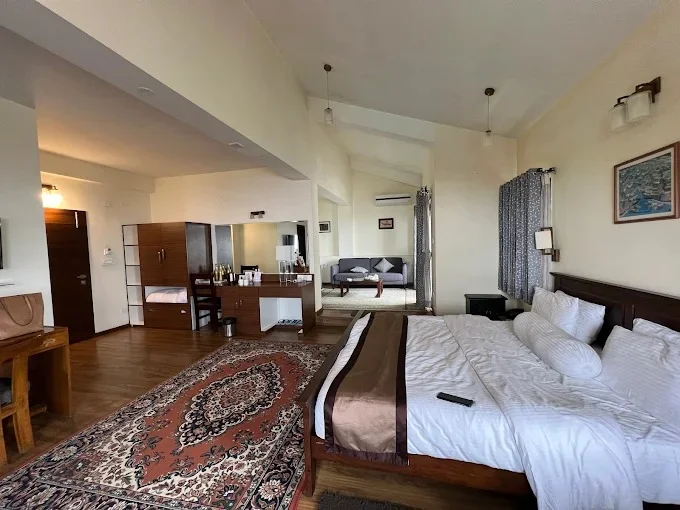 Each room is furnished with comfortable bedding, seating areas, storage space, and modern bathrooms. Interiors are simple, clean, and thoughtfully arranged to support rest and privacy. Heating arrangements are available during colder months, which is important given Kurseongs cool climate.