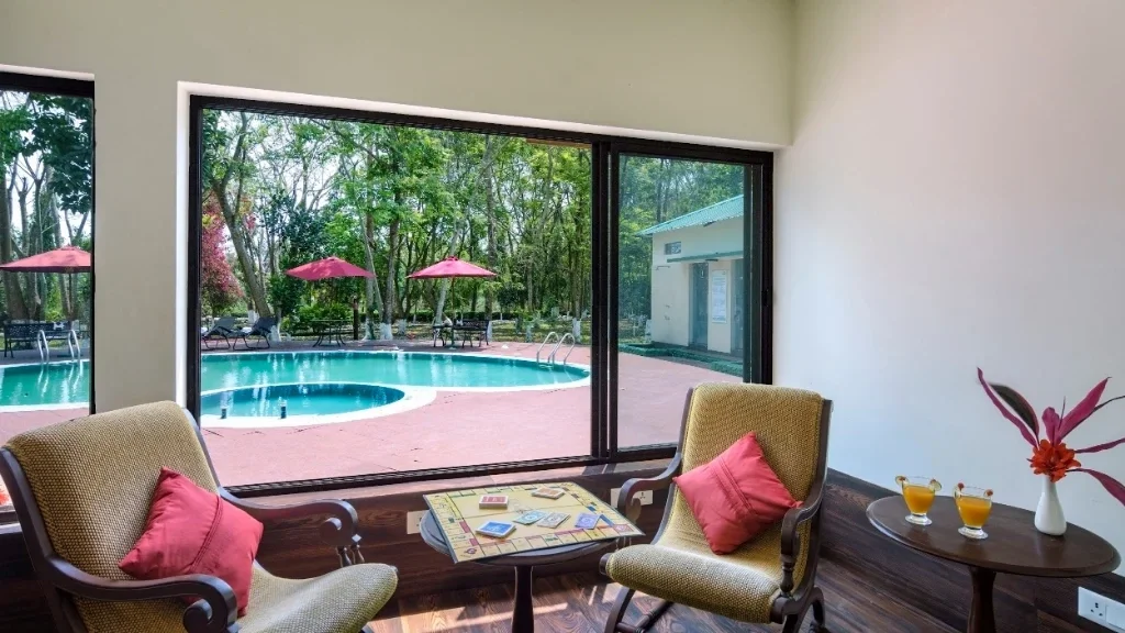 Room amenities include comfortable beds, air conditioning, attached modern bathrooms, tea and coffee facilities, and essential in-room conveniences. The calming ambience of the rooms ensures a restful experience after a day spent exploring the forests and nearby attractions.