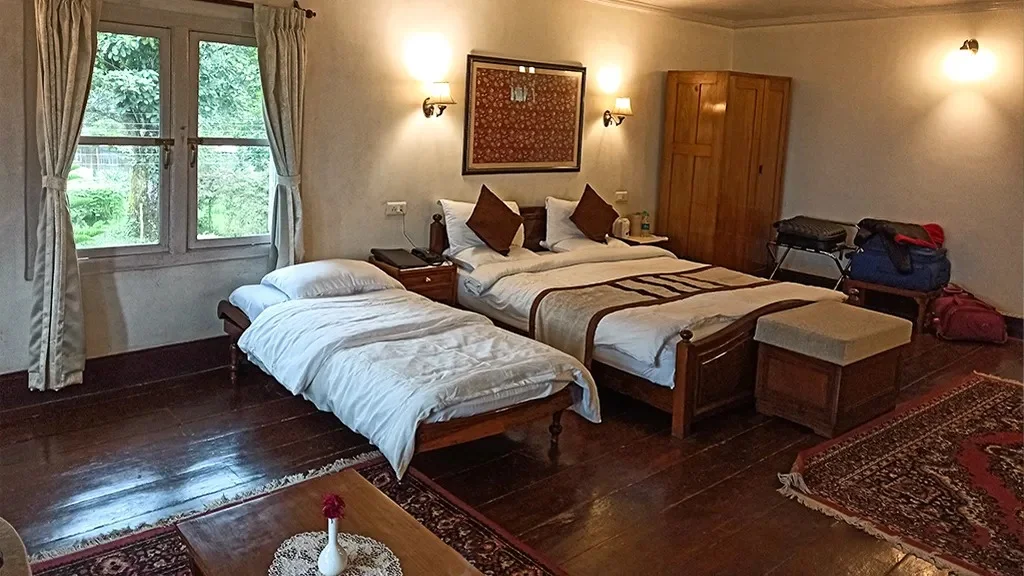The Living Experience With only four exclusive suites, Tumsong offers privacy, personalized service, and an atmosphere of true stillness. Each suite is decorated in a tasteful fusion of colonial and local styles – wooden floors, vintage four-poster beds, handwoven textiles, and panoramic windows that open to mountain and valley views. Bathrooms are modern and spacious, yet maintain a rustic charm with copper fixtures and natural stone accents. Fireplaces warm the chilly evenings, while handcrafted quilts add a personal, cozy touch. What sets Tumsong apart is that there’s no rush here. Days are slow, meals are leisurely, and the quiet is only interrupted by the rustle of the wind or the soft clink of tea cups.