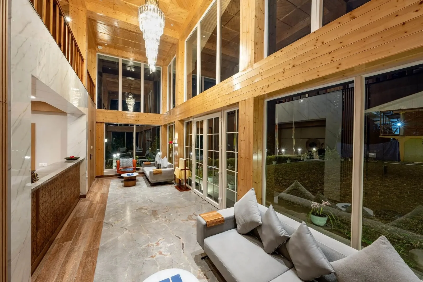Public areas of the resort are designed to be practical and inviting, offering spaces where guests can relax, plan their day, or enjoy conversation while taking in views of the surrounding hills and forests.